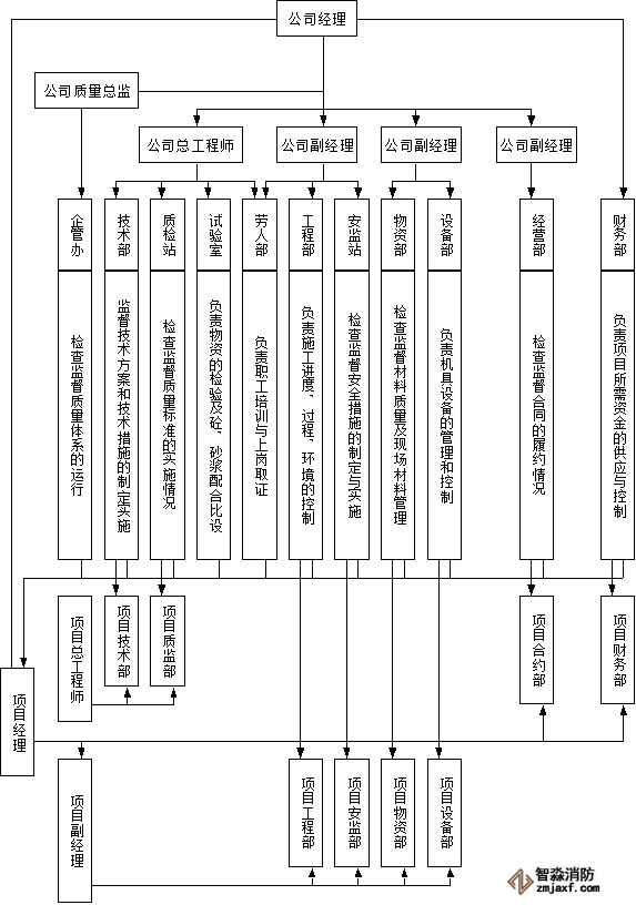 2.1按貫標認證的要求組成項目經理部,健全完善的質量體系,根據ISO9001:2000國際標準要求,組建工程項目經理部,項目經理部設項目經理、技術負責人及四部一室(材料設備部、技術質安部、生產經營部、財務勞資部、綜合辦公室),項目經理代表我方對項目全面負責,是工程質量的第一負責人,在項目上實施制定的質量方針和“質量、工期、服務”的企業宗旨,全面履行工程合同。技術負責人對項目經理負責,協助項目經理監督管理項目質量體系的運行,
