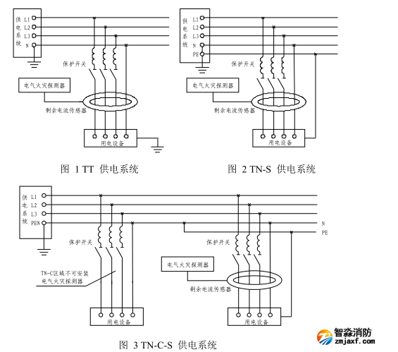 3) 在不同接地方式的供電系統中,電氣火災監控系統的監控節點應按以下示意圖進行設置安裝。