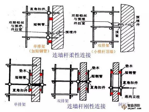 1、利用穿墻螺栓孔,使用三角形支架作底座搭設(shè)鋼管腳手架,高度一般為3個樓層高9個人認(rèn)為不安全因素較多,不提倡,但成本低)。