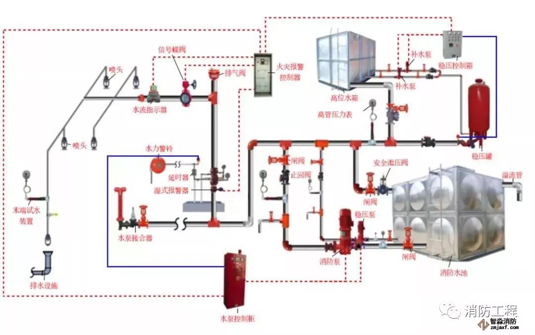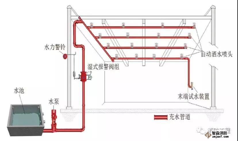 濕式系統在準工作狀態時管道內充滿用于啟動系統的有壓水的閉式系統,濕式系統由閉式噴頭、濕式報警閥組、水流指示器或壓力開關,供水設施及供水配水管道等組成。