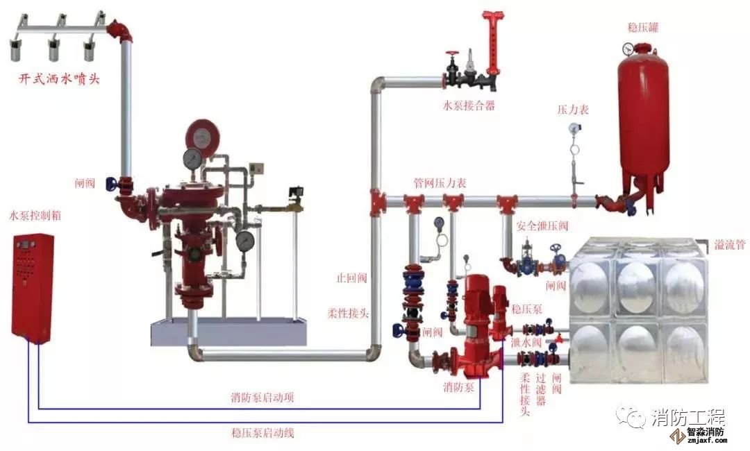 雨淋系統由雨淋閥控制噴水范圍,由配套的火災自動報警系統或傳動管系統啟動雨淋閥,由開式噴頭、雨淋閥組、水流報警裝置、供水設施及供水配水管道等組成。