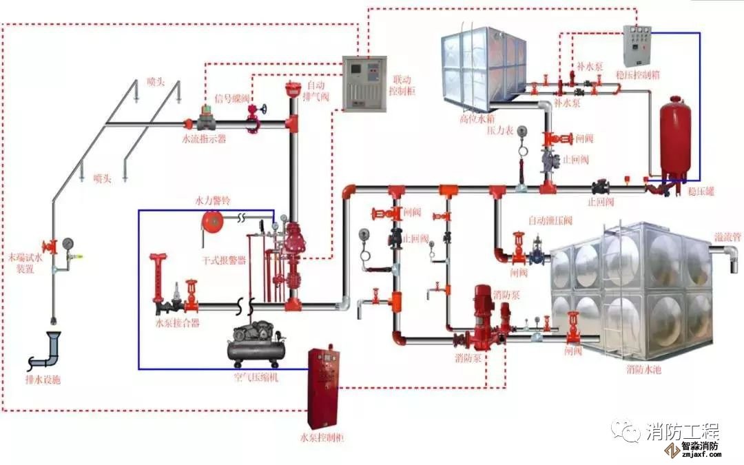 干式系統在準工作狀態時管道內充滿用于啟動系統的有壓氣體的閉式系統,干式系統由閉式噴頭、干式報警閥組、充氣設備、水流指示器或壓力開關,供水設施及供水配水管道等組成。