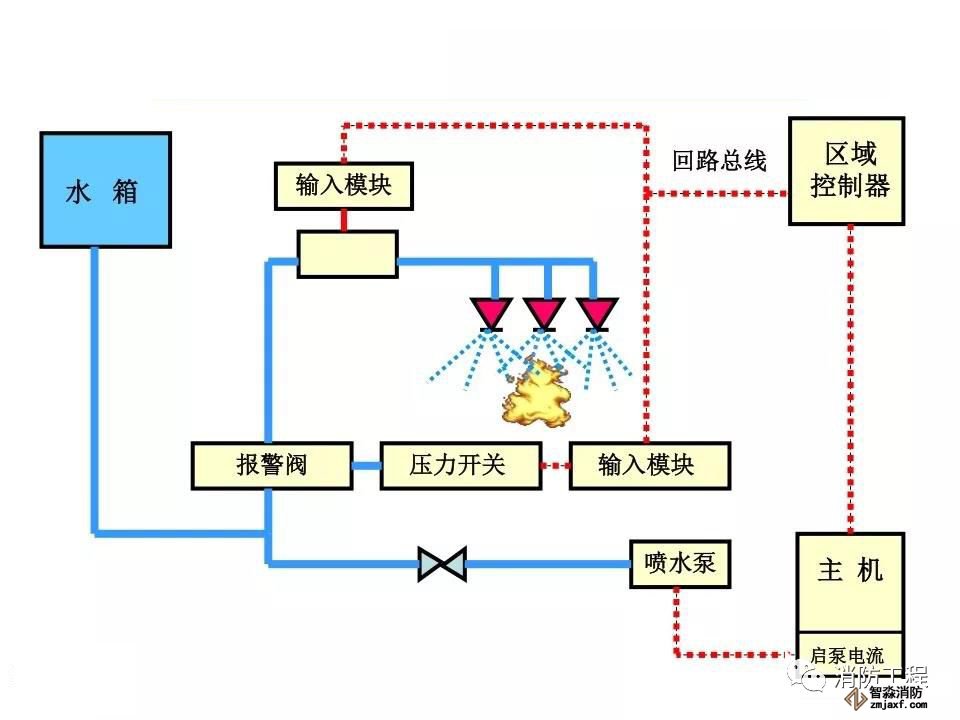 由閉式灑水噴頭、水流指示器、預作用報警閥組以及管道和供水設施等組成,準工作狀態時配水管道內不充水,由火災自動報警系統自動開啟雨淋報警閥后,轉換成為濕式系統的閉式系統。