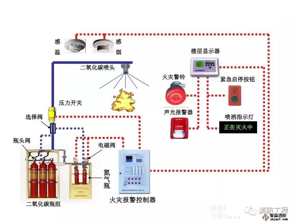 滅火系統主要由自動報警滅火控制系統、滅火劑儲瓶、瓶頭閥、啟動氣體儲瓶、電磁瓶頭閥、選擇閥、稱重裝置、單向閥、壓力開關、框架、噴嘴、管道等設備組成。