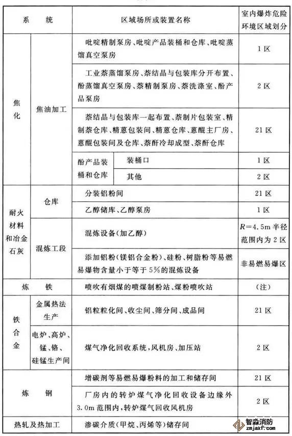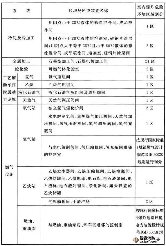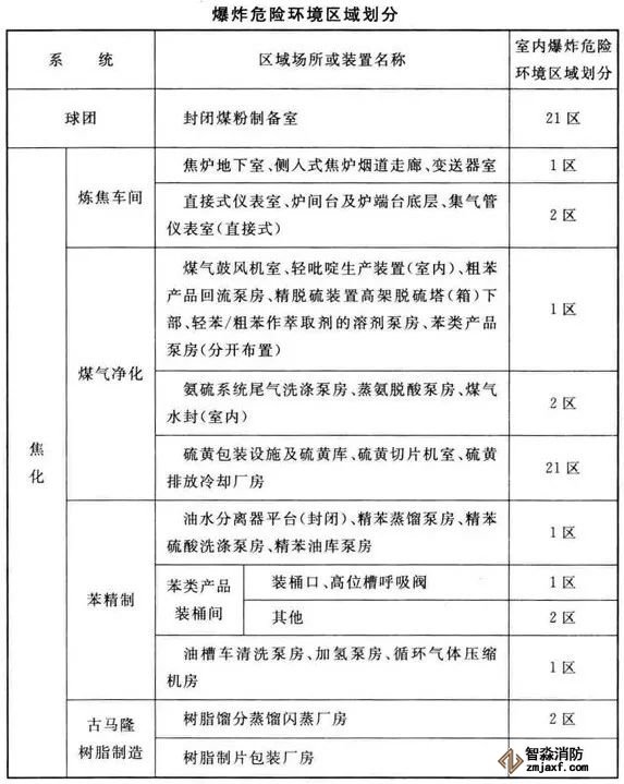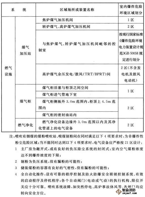 3、可能散發可燃氣體、可燃蒸氣的煤氣凈化系統的鼓冷、脫硫、粗苯、油庫,苯精制,焦爐地下室,煤氣燒嘴操作平臺等工藝裝置區和儲運區等,在其爆炸危險環境2區內以及附加2區內(具體如下表爆炸危險環境區域劃分),應設置可燃氣體探測報警系統。