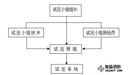 試壓時(shí)成立專(zhuān)門(mén)的試壓小組,試壓小組設(shè)組長(zhǎng)一人,試壓時(shí)聽(tīng)從組長(zhǎng)指揮,試壓組織方塊圖如下: