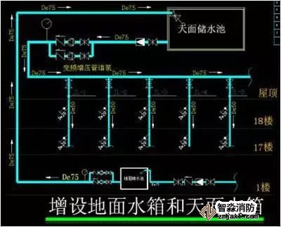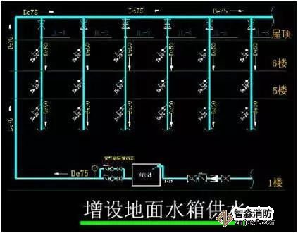 當市政管網的供水壓力夠大(能夠到達最高樓層)但是管徑偏?。ㄐ∮贒e50)時,則可在樓頂增設屋頂冷水箱,市政管網接入屋頂冷水箱進行蓄水,在供水的主管道上安裝增壓水泵和變頻控制器,壓力控制以滿足最高樓層的供水壓力不小0.15MPa為準。