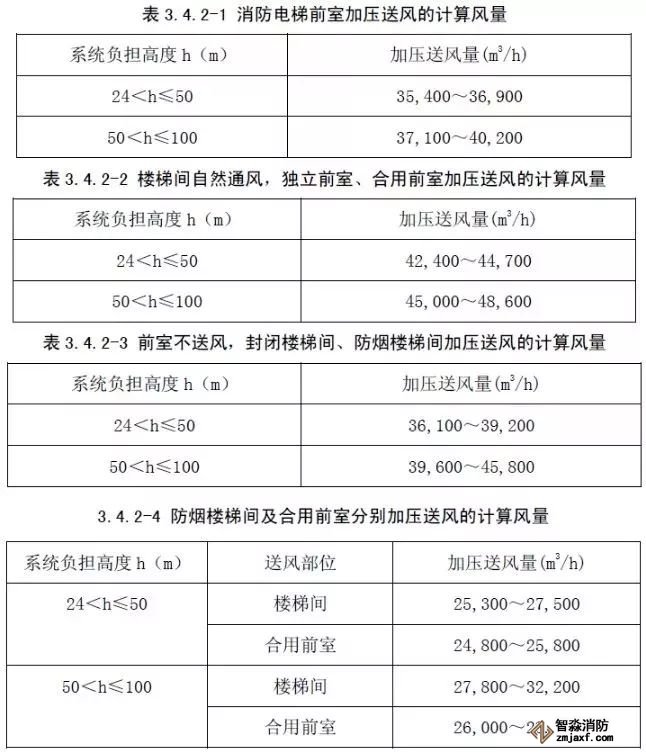 第3.4.2條防煙樓梯間、獨立前室、合用前室、共用前室和消防電梯前室的機械加壓送風的計算風量應由本規范第3.4.5~第3.4.8條的規定計算確定。