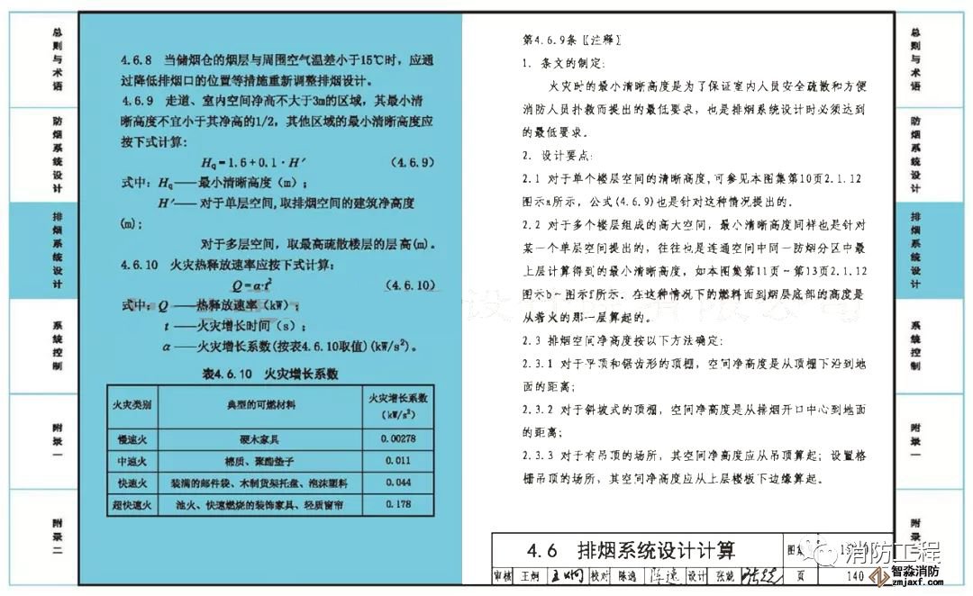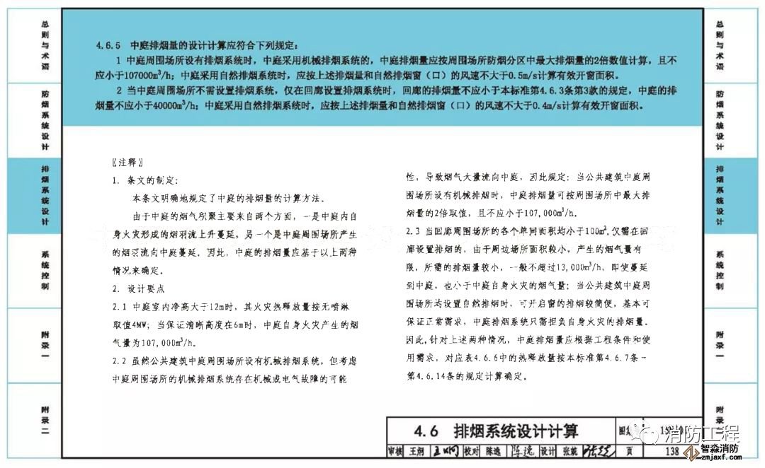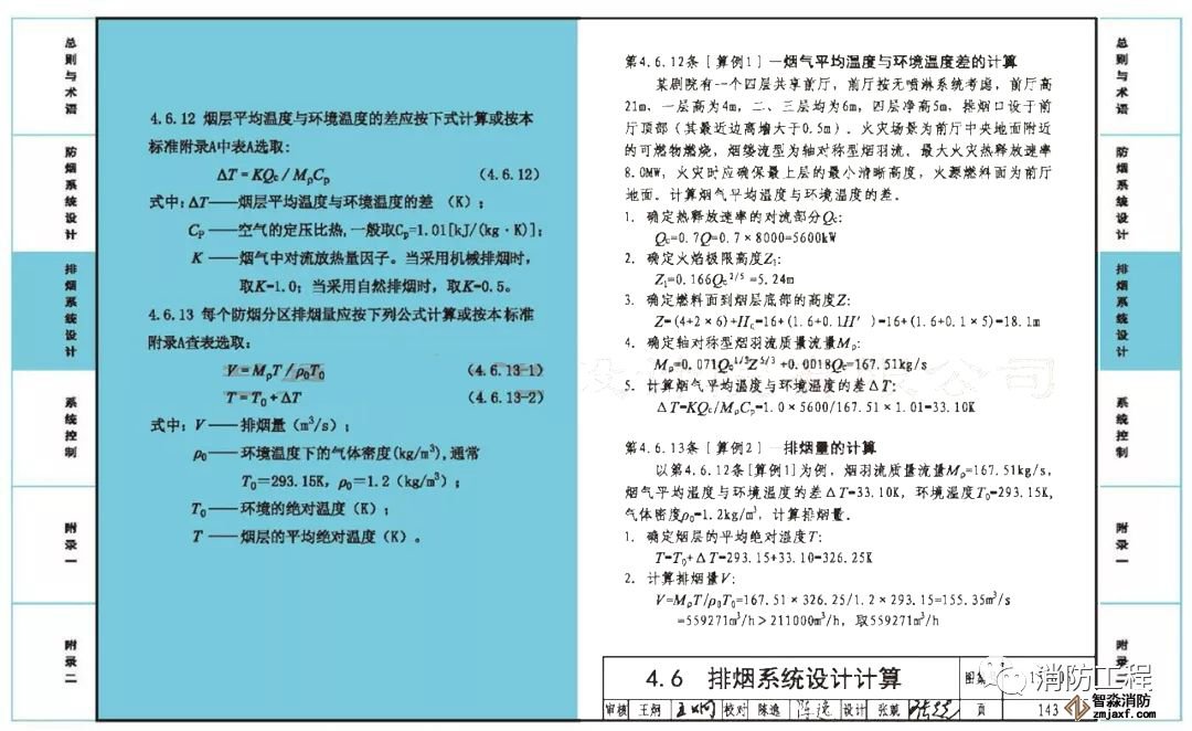 8、第143頁“第4.6.12條[算例1]”:一是字體小了;二是結合《自動噴水滅火系統設計規范》GB50084-2017,將前廳排煙計算從“有噴淋”改為“無噴淋”。