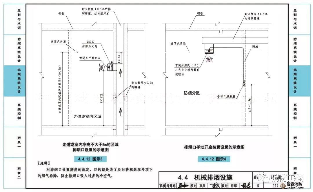 5、第112頁的“4.4.12圖示3”中側墻上安裝常閉多葉排煙口前,排煙支管上增加了“280℃排煙防火閥”。