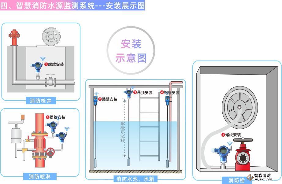 智慧消防水源監測系統,利用物聯網技術,實時監測單位室內消火栓、噴淋末端試水最不利點壓力以及消防水箱、水池的液位值,是專門針對建筑消防用水信息的實時采集、傳遞和處理系統,確保消防用水設施全時段、全天候在位、可用。通過手機APP,動態監控、立體呈現聯網單位消防安全狀態,全面提升社會單位消防安全管理水平和消防監督執法效能。