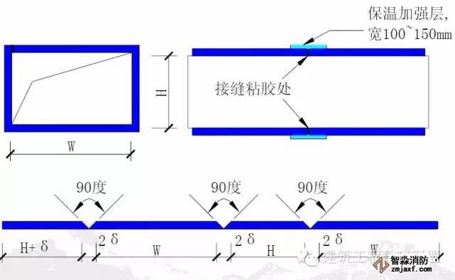 3、方形風管保溫900轉角 處采用45度拼裝,保溫板 裁900角時不要割透,預留 5mm厚作為整體轉角用, 然后用膠水進行拼縫。
