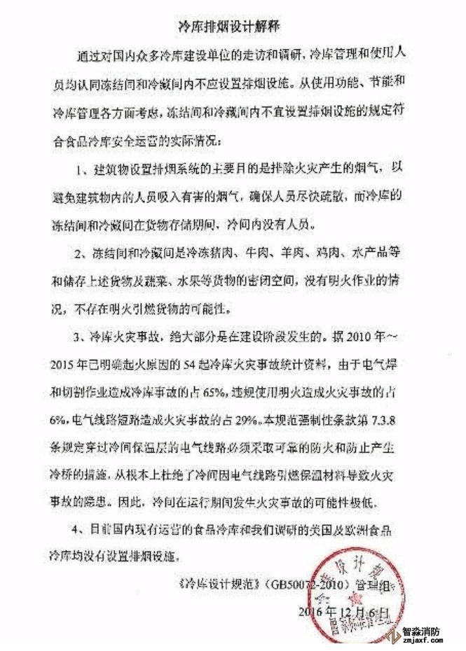 經常有人問及冷庫的排煙設施問題,本文引用《冷庫設計規范》管理組復函,供參考!