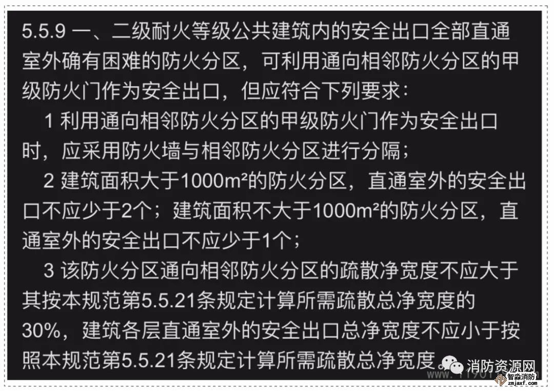 1、耐火等級為一級或二級的公共建筑,相鄰布置的防火分區,如某防火分區的安全出口全部直通室外確有困難,可利用防火墻上通向相鄰防火分區的甲級防火門,作為安全出口,詳見《建規》5.5.9: