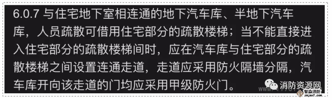 3、與住宅地下室相連通的地下汽車庫(或半地下汽車庫),汽車庫的人員疏散,可借用住宅部分的疏散樓梯,詳見《 汽車庫、修車庫、停車場設計防火規范》6.0.7: