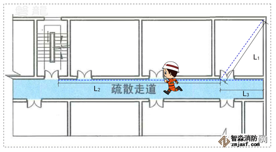 1、有些特殊情況下,房間并沒有向疏散走道開設疏散門(房間用作其他功能空間或通過其他疏散走道疏散),就可能出現L3較大的情況(示例4),這時應予控制。本示例中,L3可以參照房間內任一點至房間直通疏散走道的疏散門的直線距離(L1)控制。