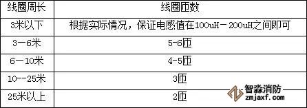 為了使檢測器工作在最佳狀態下,線圈的電感量應保持在100uH-300uH之間。在線圈電感不變的情況下,線圈的匝數與周長有著重要關系。周長越小,匝數就越多。一般可參照下表: