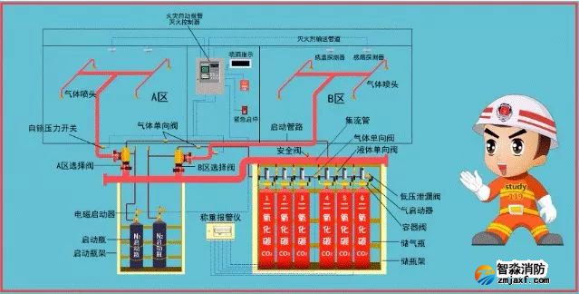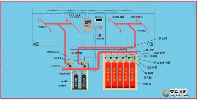 該系統由滅火劑儲存裝置、總控閥、驅動器、噴頭、管道超壓泄放裝置、信號反饋裝置、控制器等組成。
