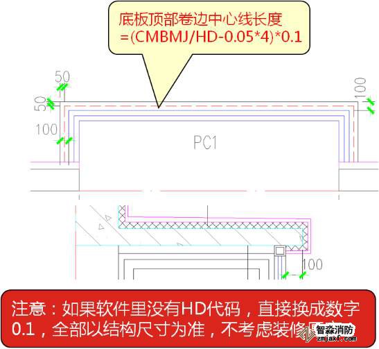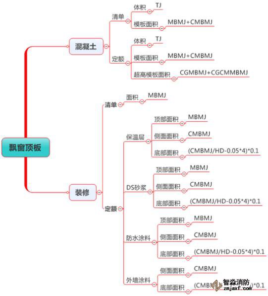 估計很多朋友看不懂“(CMBMJ/HD-0.05*4)*0.1”,我解釋下,CMBMJ是飄窗底板側面模板面積,除以HD(厚度)就是側面長度,減去0.05*4就是我們要求底板裝修上翻的中心線長度,在乘以0.1就是上翻的面積。