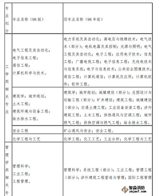 (一)取得消防工程專業大學專科學歷,工作滿6年,其中從事消防安全技術工作滿4年;或者取得消防工程相關專業(見消防工程相關專業新舊對照表,下同)大學專科學歷,工作滿7年,其中從事消防安全技術工作滿5年。