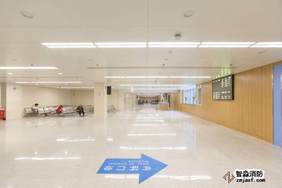 診室候診區(qū)燈具、噴頭、風(fēng)口、煙感排布精細美觀,橫成排、豎成行、斜成線,錯落有致。