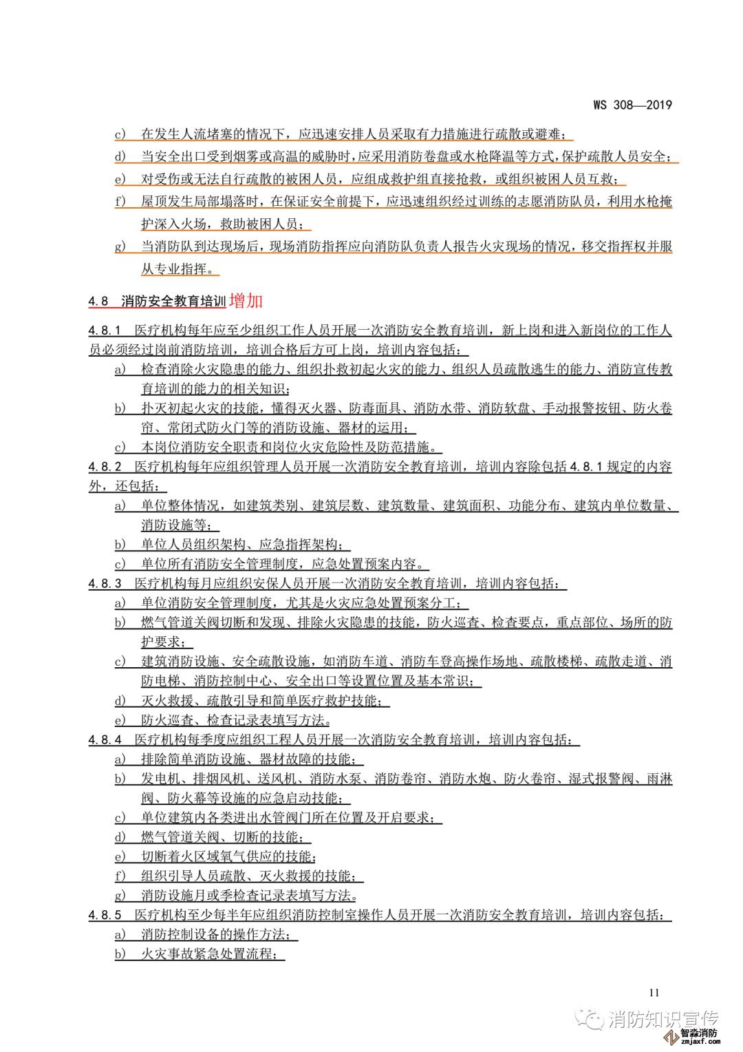 4.8.2 醫療機構每年應組織管理人員開展一次消防安全教育培訓,培訓內容除包括 4.8.1 規定的內容外,還包括: