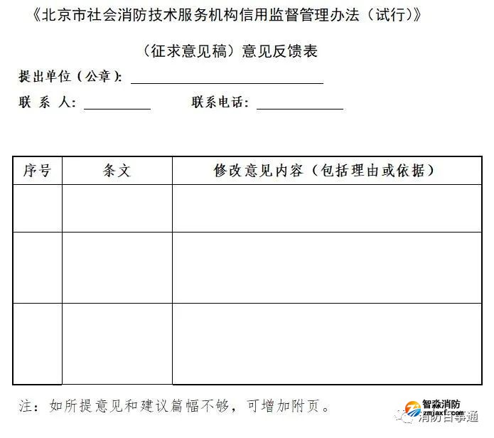 關于征求《北京市社會消防技術服務機構信用監督管理辦法(試行)》(征求意見稿)意見的通知為進一步優化營商環境,規范社會消防技術服務機構市場秩序,增強社會消防技術服務市場誠信意識,提高事中事后監管效能,北京市消防救援總隊制定了《北京市社會消防技術服務機構信用監督管理辦法(試行)》(見附件1),現向社會公開征求意見。請結合實際工作認真研究,將意見填入“意見反饋表”(見附件2)中,于2022年4月8日前,將加蓋公章的意見反饋表及word版原件發送至lyq401@163.com。1.《北京市社會消防技術服務機構信用監督管理辦法(試行)》征求意見稿北京市社會消防技術服務機構信用監督管理辦法(試行)第一條 為進一步優化營商環境,規范社會消防技術服務機構市場秩序,增強社會消防技術服務市場誠信意識,提高事中事后監管效能,根據《關于深化消防執法改革的實施意見》、《社會消防技術服務管理規定》、《北京市優化營商環境條例》等規定要求,制定本辦法。第二條 北京市消防救援機構對本市行政區域內開展消防技術服務活動的社會消防技術服務機構實施信用評價、信用監管、信用公示、修復和信用懲戒等,適用本辦法。第三條 社會消防技術服務機構應當依照法律法規、國家、行業、地方標準和執業準則開展技術服務活動,并對服務質量負責。第四條 倡導和鼓勵社會消防技術服務機構積極參加公益性消防技術服務以及消防救援機構組織的重要場所消防服務保障、消防行政管理輔助活動等。第五條 社會消防技術服務機構應當加強誠信建設和守信教育,健全內部誠信制度,提高誠信經營水平。第六條 消防技術服務機構信用等級劃分為優(A、A-)、良(B+、B、B-)、中(C+、C、C-)、差(D)四等九級。第七條 消防技術服務機構信用等級評價采用積分制,分值由基礎分、加分、減分構成,基礎分為700分。第八條 消防技術服務機構信用等級根據評價周期內積分確定:第九條 消防技術服務機構信用等級評價周期為一個自然年度,每個評價周期初始分值為700分,評價周期屆滿,積分清除,不轉入下一個評價周期。首次評價周期為評價標準發布之日至當年12月31日。第十條 在評價周期內,評價對象在重大火災事故、特別重大火災事故中負有主要責任或被列入消防安全嚴重失信主體名單的,直接評定為D級并即時調整公布評價信息。第十一條 消防技術服務機構信用等級評價結果在市消防救援總隊相關網站進行公示,公示期滿后,向社會正式公布。第十二條 消防技術服務機構對信用評價結果有異議的,可在結果公示之日起7個工作日內,向市消防救援總隊提交異議申請。市消防救援總隊自收到異議申請之日起7個工作日內給予書面答復。申請被采納的,對評價結果進行調整。第十三條 消防技術服務機構具有下列行為之一的,每項次減100分:(三)冒用其他消防技術服務機構名義從事社會消防技術服務活動的;(四)無健全的質量管理體系或消防安全評估過程控制體系的;(五)經火災事故調查認定,對亡人或重大社會影響的火災事故負有主要責任的;第十四條 消防技術服務機構具有下列行為之一的,每項次減50分:(二)所屬注冊消防工程師同時在兩個以上消防技術服務機構執業或在其他機關、團體、企業、事業單位任職的;(三)指派無相應資格從業人員從事社會消防技術服務活動的;(四)消防設施維護保養檢測機構的項目負責人或者消防設施操作員未到現場實地開展工作的;(六)未按照國家、行業、地方標準開展檢測、維護保養、評估的。第十五條 消防技術服務機構具有下列行為之一的,每項次減25分:(四)未在經營場所公示營業執照、工作程序、收費標準、從業守則、注冊消防工程師注冊證書、投訴電話等事項的;(五)未在經其維護保養的消防設施所在建筑的醒目位置上公示消防技術服務信息的。第十六條 消防技術服務機構具有下列行為之一的,每項次減10分:(一)未將發現的隱患問題以書面形式告知委托人并制定整改方案的;(三)未在“北京市消防技術服務機構監督管理系統”(以下簡稱“管理系統”)備案消防技術服務項目合同、出具的書面結論文件的;(四)開展執業項目時指派的消防設施操作員低于兩人的;(五)開展執業項目時指派的消防設施操作員無中級技能等級以上的。第十七條 消防技術服務機構聘請的一級注冊消防工程師在2人以上,每多聘請1人加5分,最多加50分;取得消防設施操作員國家職業資格證書的人員在6人以上(其中中級2人以上),每多聘請1名中級技能等級的人員加2分,最多加20分,每多聘請1名高級技能等級的人員加5分,最多加50分。消防技術服務機構執業人員的認定數量為本年度執業人員執業時間跨度不低于6個月且執業不少于3個項目的人員數量。第十八條 消防技術服務機構在開展執業活動中,獲得省、部級以上榮譽表彰的,每次對該機構加20分,最多加40分。第十九條 消防技術服務機構參加省級以上的職業技能競賽,獲得消防職業技能競賽一等獎的,對該機構加20分;獲得消防職業技能競賽二等獎的,對該機構加15分;獲得消防職業技能競賽三等獎的,對該機構加10分。第二十條 消防技術服務機構的從業人員被消防救援機構聘為省、部級專家的,每人次為該機構加10分,最多加20分。第二十一條 消防技術服務機構參與編寫國家、行業、地方消防技術標準的,每項次對該機