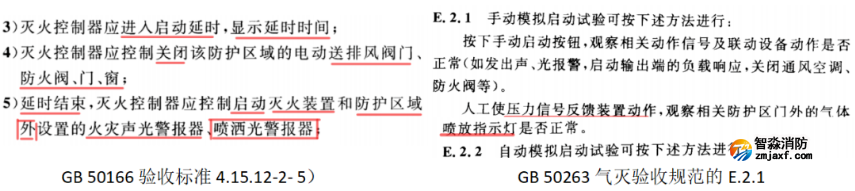 GB 50166驗(yàn)收標(biāo)準(zhǔn)中規(guī)定很明確:啟動(dòng)延時(shí)(通常設(shè)置30秒)結(jié)束后,在滅火裝置啟動(dòng)的同時(shí)點(diǎn)亮“放氣指示燈”。按理說不應(yīng)產(chǎn)生爭議,但看一下GB 50263的E.2.1,確實(shí)提及:壓力開關(guān)動(dòng)作(反饋)后,才點(diǎn)亮“放氣指示燈”。
