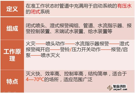 濕式系統由閉式灑水噴頭、水流指示器、濕式報警閥組以及管道和供水設施等組成,準工作狀態時管道內充滿用于啟動系統的有壓水的閉式系統。