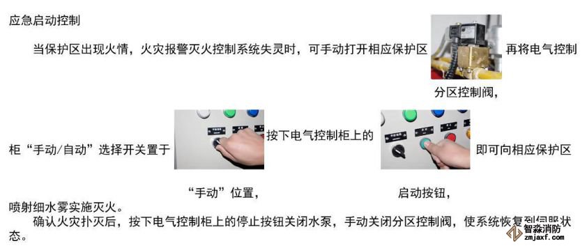 當保護區人為發現火情時,可按下相應區域的手動報警按鈕或火災報警滅火控制器上的相應區的啟動按鈕,即可按預定程序啟動滅火系統,釋放細水霧,實施滅火。