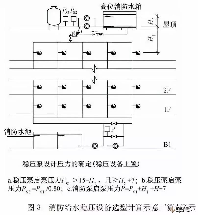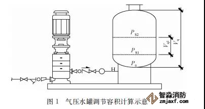 臨時高壓消防給水系統一般均應設置高位消防水箱(除符合規范規定可不設的情形外),且對其設置高度有一定要求。日本規范規定自動噴水滅火系統屋頂消防水箱最不利的最低供水壓力為0.15 MPa,美國、英國規范則要求0.10 MPa。我國1987年版和2006年版“建規”對比均沒有規定,只在條文中要求重力自流的消防水箱應設置在建筑的最高部位。1982年版《高層民用建筑設計規范》(以下簡稱“高規”)首次提出屋頂消防水箱應滿足最不利消火栓的靜水壓力,但沒有提出設計參數,1995年版“高規”做了具體規定。國標圖集98S205編制目的是為解決臨時高壓消防給水系統高位消防水箱設置高度滿足不了系統最不利點靜水壓力時應設增壓設施的要求,其為消防專用的增壓穩壓設備的主要功能只是火災初期時、消防主泵啟動前,確保具有足夠消防壓力的30 s儲水量進行初期火災撲救,直至消防主泵全負荷啟動運行。這里更多的還是強調增壓的概念,設備類似于氣壓供水,發揮主要作用的是氣壓水罐,穩壓水泵的作用是在3 min內,補足氣壓水罐內實際穩壓水容積。利用氣壓水罐所設定的P1、P2、PS1和PS2運行壓力來控制穩壓泵運行工況。P1為根據計算求得消火栓系統或自動噴水滅火系統中最不利點所需的消防壓力作為氣壓水罐的充氣壓力。平時管道系統如有滲漏泄壓等情況,控制穩壓水泵不斷補水穩壓,在PS1、PS2(啟動-停止)反復運行,一旦有火情,管道系統大量缺水,造成PS1下降(PS1→P2),降至P2時,立即啟動消防主泵。