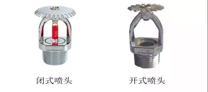 2、 自動噴水滅火系統(tǒng)根據(jù)噴頭的不同可以分為兩類,使用閉式噴頭(注意噴頭中間的紅色玻璃管)就是閉式系統(tǒng),使用開式噴頭的為開式系統(tǒng)。其中閉式系統(tǒng)包括濕式系統(tǒng)、干式系統(tǒng)和預(yù)作用系統(tǒng);開式系統(tǒng)包括雨淋系統(tǒng)、水幕系統(tǒng)。