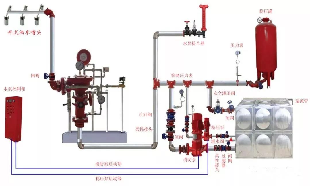 6、 預(yù)作用系統(tǒng)在準(zhǔn)工作狀態(tài)時配水管道內(nèi)不充水,由火災(zāi)自動報警器自動開啟預(yù)作用閥后,轉(zhuǎn)換為濕式系統(tǒng),預(yù)作用系統(tǒng)由閉式噴頭、預(yù)作用閥組、充氣設(shè)備(不是必須有)、水流報警裝置、供水設(shè)施及供水配水管道等組成。