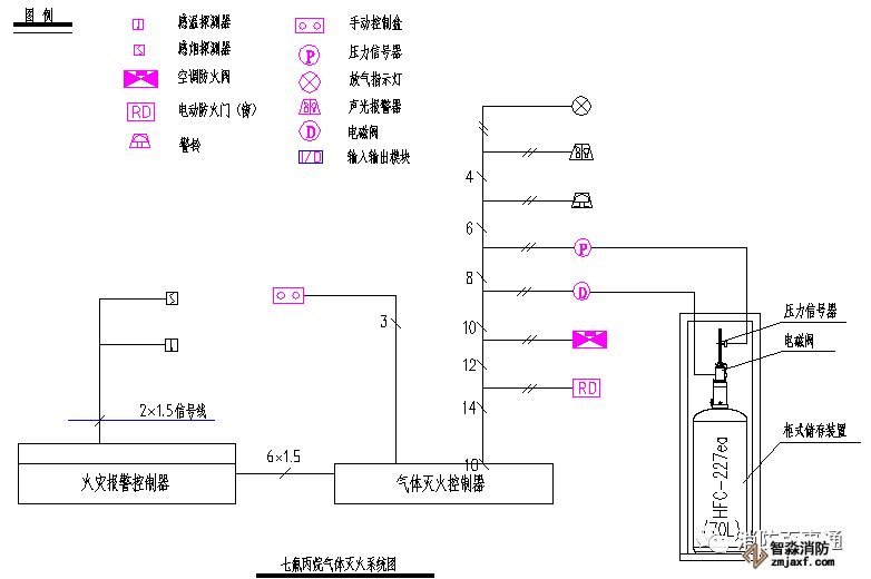 下面簡述一下該氣體滅火系統的組成方式,即參照《火災自動報警系統設計規范》GB50116-2013第4.4.3條,氣體滅火控制器、泡沫滅火控制器不直接連接火災探測器的組成方式,火災報警控制器設置在消防監控中心,防護區設置的感煙探測器和感溫探測器直接連接到消防控制中心的集中報警控制器上,消防控制中心的火災報警控制器通過總線控制模塊聯動切除空調系統和防火閥,關閉防火卷簾門等;氣體滅火控制器設置在防護區的鋼瓶組附近,連接防護區內的聲光報警器和防護區外的聲光報警器、以及啟動鋼瓶的電磁閥和氣體釋放的壓力開關信號機放氣指示門燈,現場緊急釋放和啟停按鈕設置在防護區門口。