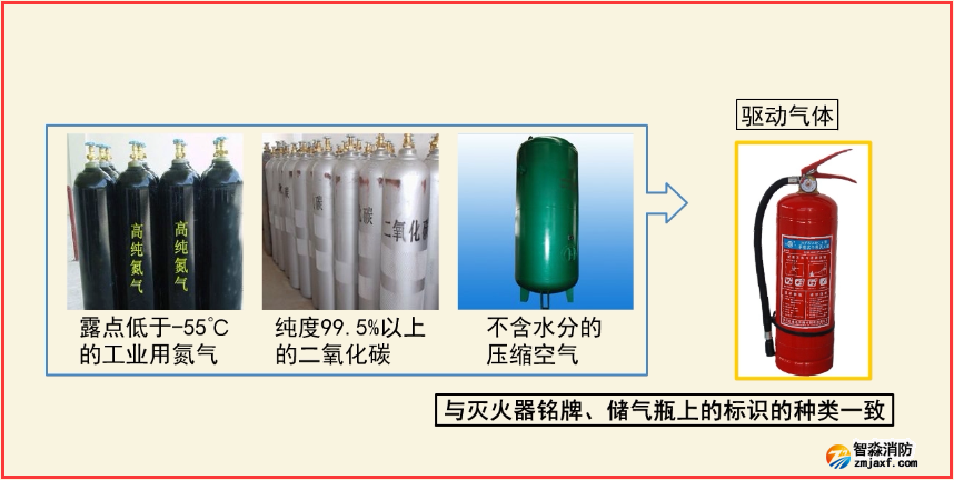 (6)儲(chǔ)壓式干粉滅火器和潔凈氣體滅火器可選用露點(diǎn)低于-55℃的工業(yè)用氮?dú)狻⒓兌?9.5%以上的二氧化碳、不含水分的壓縮空氣等作為驅(qū)動(dòng)氣體,但要與滅火器銘牌、儲(chǔ)氣瓶上標(biāo)識(shí)的種類一致。