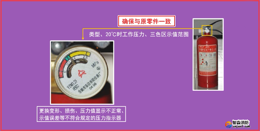 (5)更換具有嚴(yán)重?fù)p傷、變形、銹蝕等影響使用的缺陷的滅火器壓把、提把等金屬件;更換存在肉眼可見(jiàn)缺陷的儲(chǔ)氣瓶式滅火器的頂針。