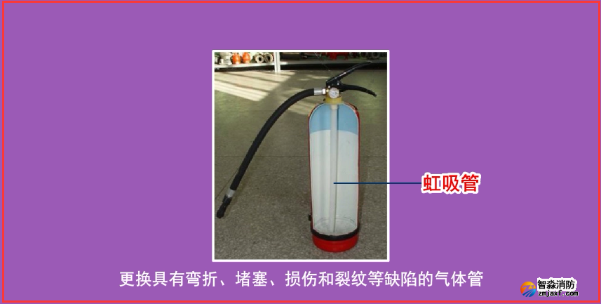 (6)更換具有彎折、堵塞、損傷和裂紋等缺陷的滅火器虹吸管、儲(chǔ)氣瓶式滅火器出氣管。