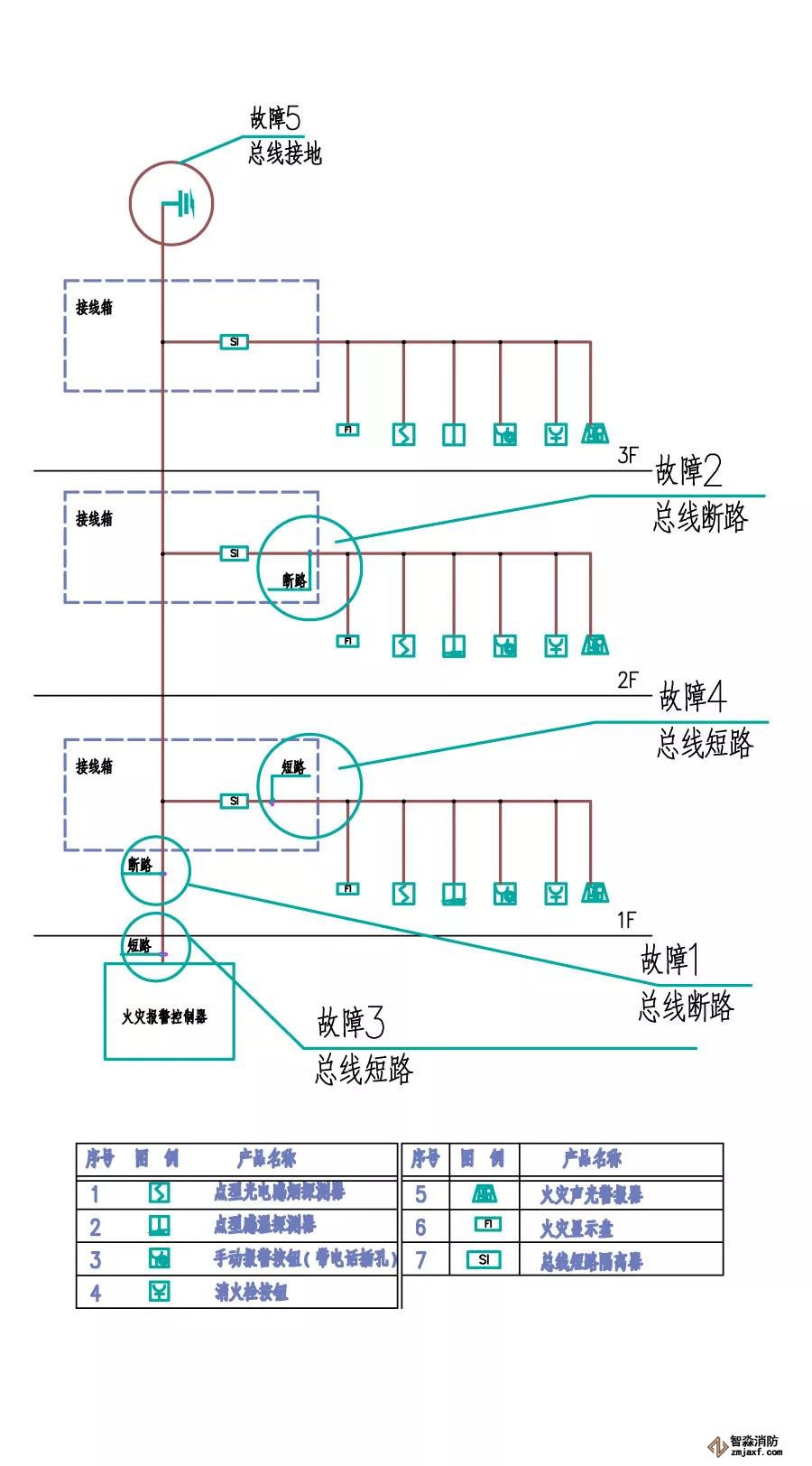 報(bào)警線路故障的原因可分為以下幾種:總線短路、總線斷路和總線接地。由于總線短路、斷路故障點(diǎn)出現(xiàn)的位置不同,火災(zāi)報(bào)警控制器中所顯示的故障現(xiàn)象也有所不同,現(xiàn)場(chǎng)設(shè)備的運(yùn)行狀態(tài)也會(huì)出現(xiàn)不同。