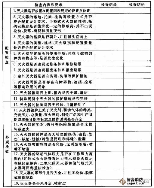 根據GB50444要求,滅火器的配置、外觀等至少每月檢查一次;對于候車(機、船)室、歌舞娛樂放映游藝等人員密集的公共場所,以及堆場、罐區、石油化工裝置區、加油站、鍋爐房、地下室等場所,至少每半月檢查一次,基本檢查內容及要求如下: